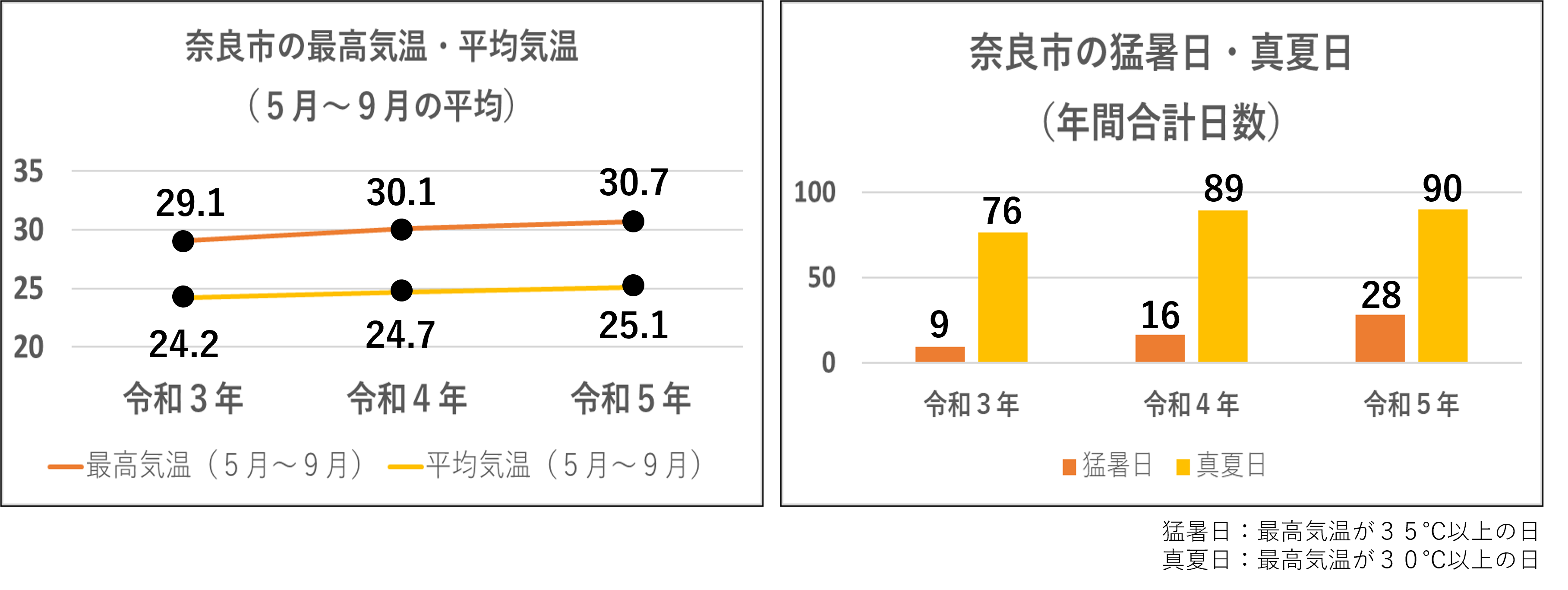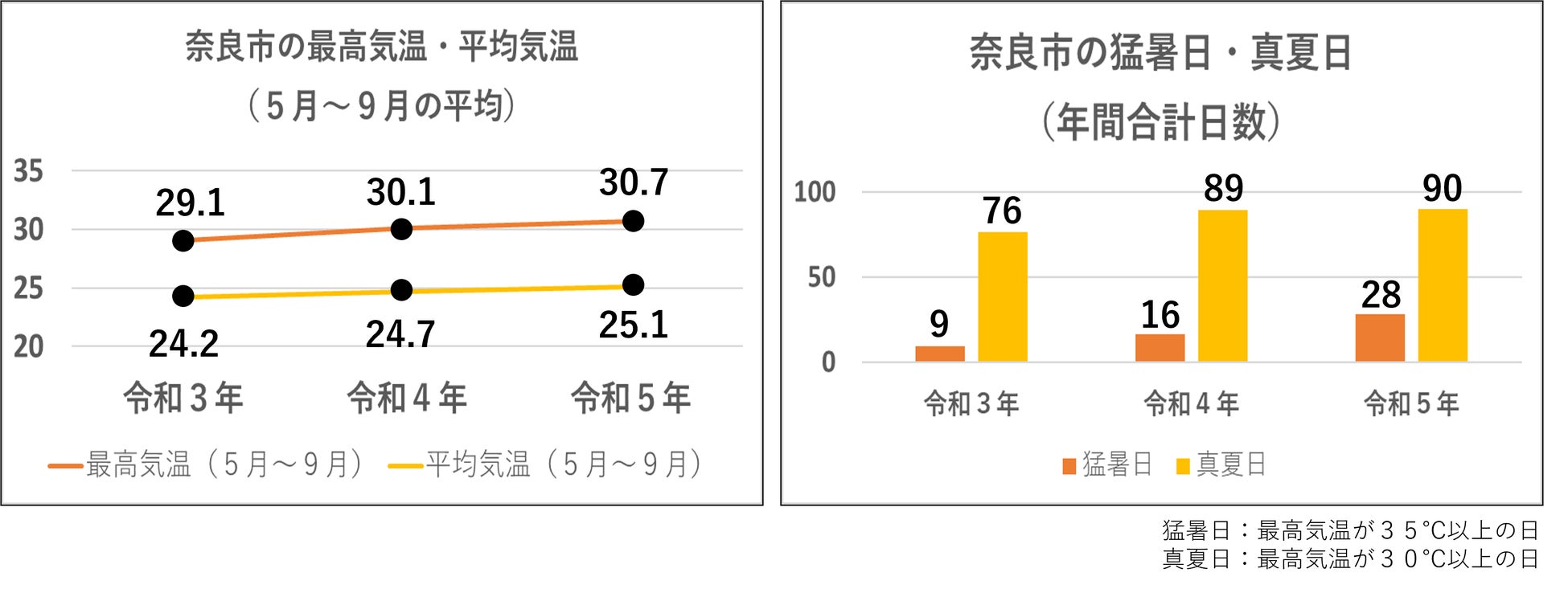 ◆奈良市の気象データ(令和3年~5年の5月~9月の平均)から、最高気温及び平均気温は年々上昇傾向にあることが分かります。また、猛暑日や真夏日も増加傾向にあります。