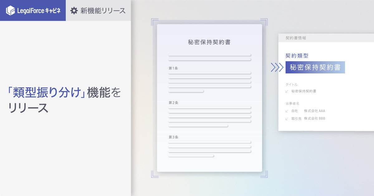 AI契約管理システム「LegalForceキャビネ」 を提供する株式会社LegalForce(本社:東京都江東区 代表取締役:角田望、以下LegalForce)は、ユーザーが「LegalForceキャビネ」にアップロードした契約書の類型の選択を支援する、「類型振り分け」機能をリリースしました。本機能により、ユーザーによる契約類型の確認作業や手動による契約類型の登録作業をサポートし、契約管理における業務の効率化を実現します。