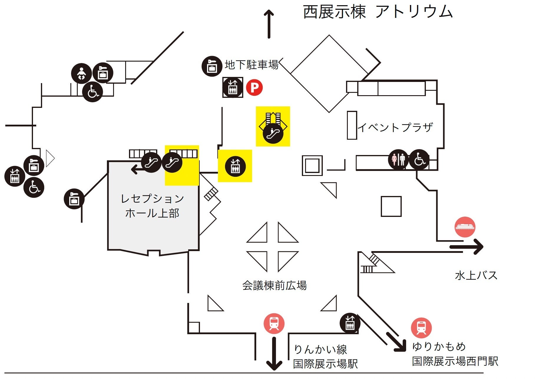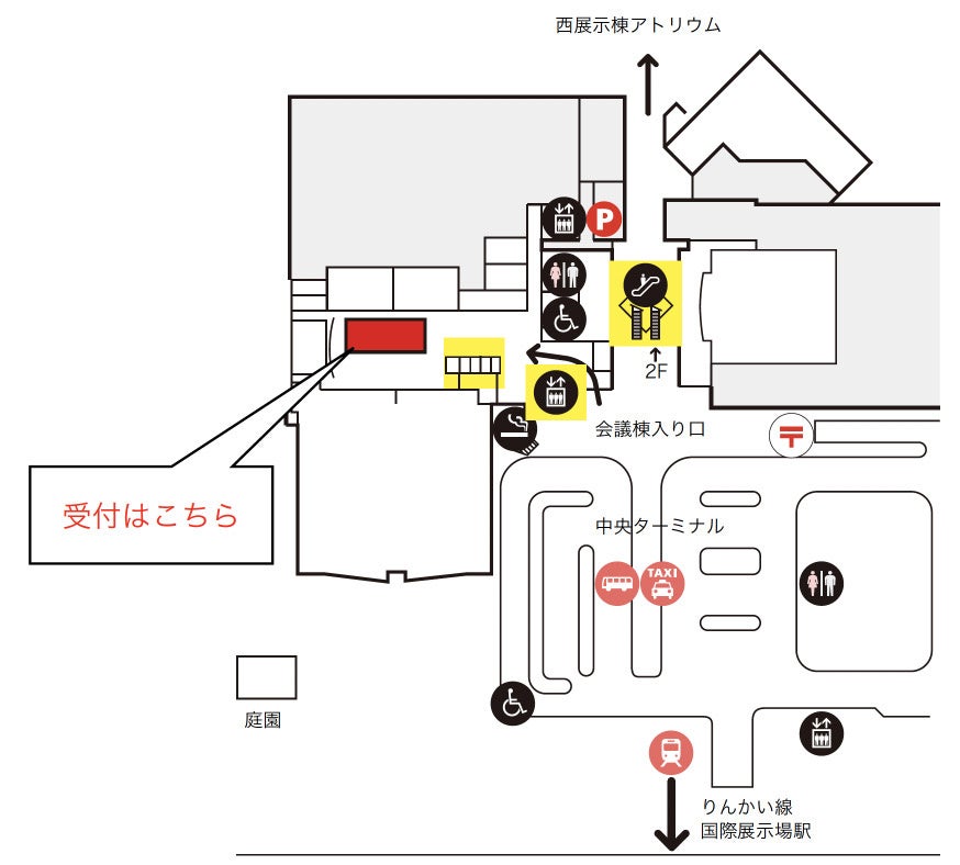 電車でお越しの場合は、会議棟2Fのエレベーター・エスカレーター(黄色くハイライトされた箇所) を降りて、会議棟1F 受付までお越しください。
