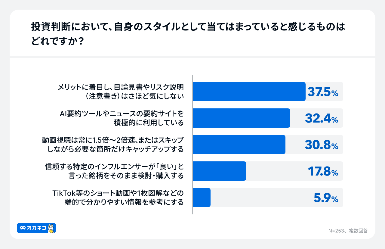 投資判断のスタイルとしても「メリットに着目し、リスク説明をさほど気にしない」という回答が37.5%に達しており、効率を重視するあまりソースの確認を省略する傾向が一定数見られます。