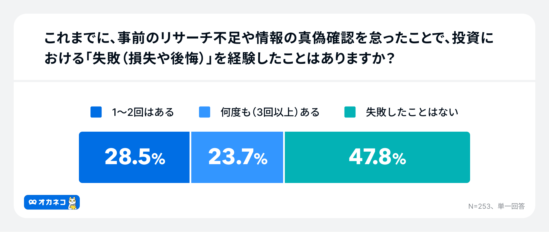 事前のリサーチ不足や情報の真偽確認を怠ったことで、投資における「失敗(損失や後悔)」を経験したことがある人は52.2%(「1〜2回はある」28.5%、「何度も(3回以上)ある」23.7%)と過半数に達しました。