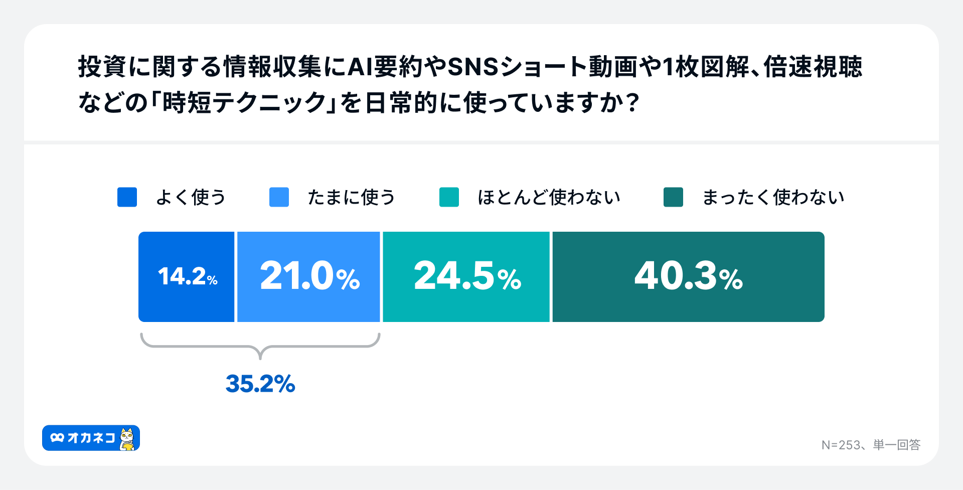 投資情報の収集において、AI要約やSNS動画、倍速視聴などの”時短テクニック”について「よく使う」14.2%、「たまに使う」21.0%と、使用している人は合計35.2%に達しました。