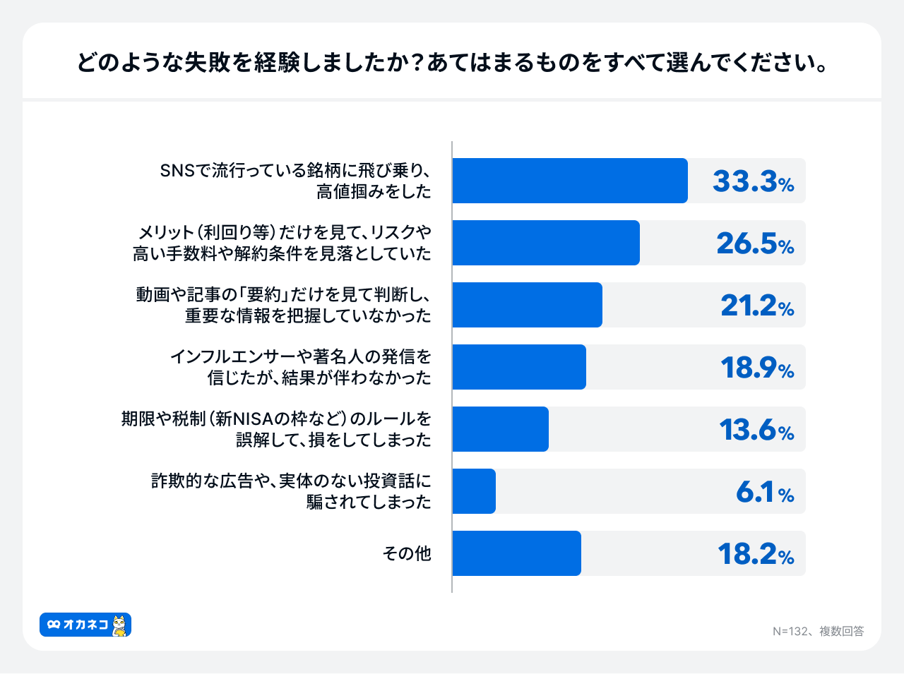 具体的な失敗内容は、「SNSで流行っている銘柄に飛び乗り、高値掴みをした」が33.3%で最多となり、次いで「メリットだけを見てリスクや手数料を見落としていた」26.5%、「動画や記事の「要約」だけを見て判断し、重要な情報を把握していなかった」21.2%と、時短重視の弊害が失敗に繋がっている状況も明らかになりました。
