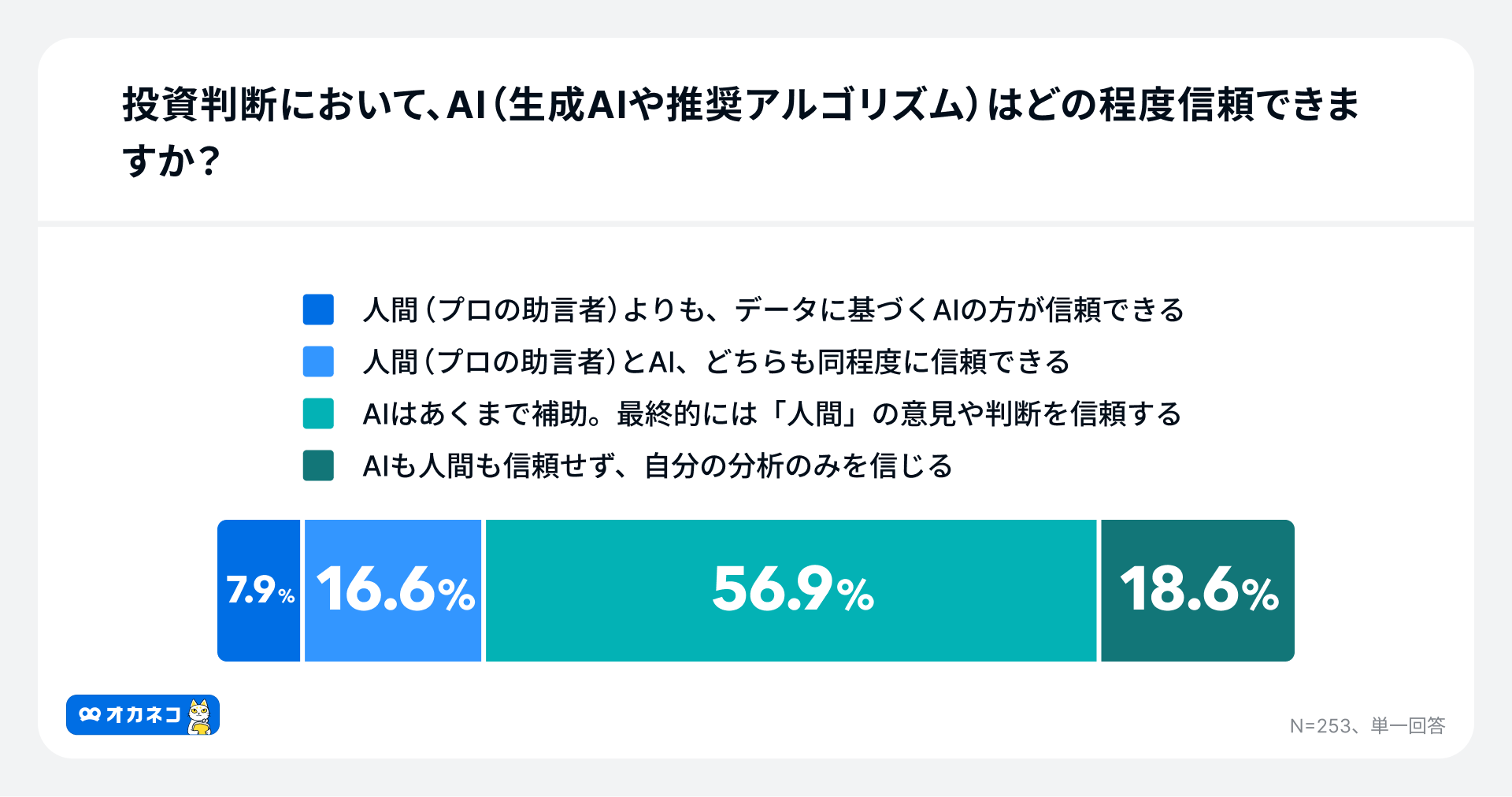 投資判断におけるAIへの信頼度については、「人間(プロの助言者)よりも、データに基づくAIの方が信頼できる」7.9%と、「人間(プロの助言者)とAI、どちらも同程度に信頼できる」16.6%を合わせ、約4人に1人(24.5%)がプロと同等以上の信頼を置いていることが明らかになりました。