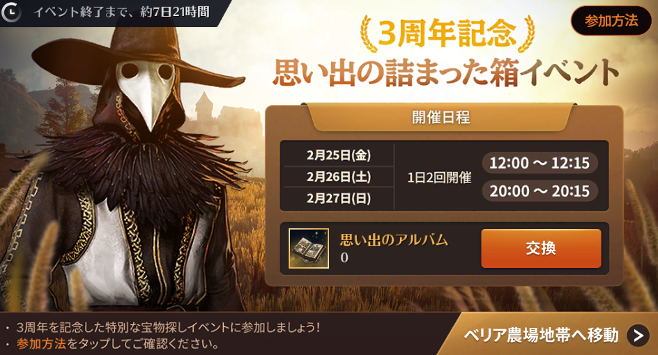 イベント期間中、毎日12:00~12:15、20:00~20:15の間、「大切な思い出」がベリア農場地帯のマップの様々な場所に出現します。「大切な思い出」をタップすると「思い出の詰まった箱」を獲得することができ、箱を開けると「思い出のアルバム」が獲得できます。ただ、ごく稀に「色褪せない思い出」も獲得することができます。