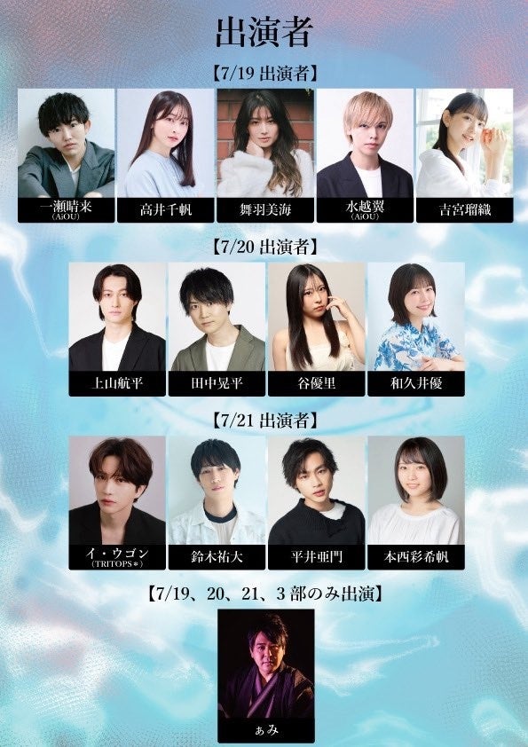 今回は、7/19(土)には、アイドルグループ「AiOU」として活動中で俳優としても活動する一瀬晴来、同じく「AiOU」のメンバーで、今回が俳優として記念すべき初舞台となる水越翼、 NHK「レギュラー番組への道『擬人化ドラマ 被告人パンダ』に出演するなど、TV・舞台・広告・雑誌など多方面で幅広く活躍中の高井千帆、宝塚歌劇団の雪組トップ娘役として活躍し退団後は、TV、映画のほか、「鬼滅の刃」「進撃の巨人-the Musical-」などの舞台にも出演している舞羽美海、声優としてアニメやライブに出演し、今年はミュージカル「インサイド・ウィリアム」にもジュリエット役で出演するなど活躍する吉宮瑠織、7/20(日)は、ミラクル☆ステージ「サンリオ男子」、劇団『ハイキュー!!』など舞台で活躍する上山航平、2.5次元からストレート舞台、他にもナレーションや朗読劇にも多数出演するなどマルチに活躍する田中晃平、「レ・ミゼラブル〜惨めなる⼈々〜」など舞台のほかにもTV、映画など幅広い活躍を見せる谷優里、「『アイドルマスターシャイニーカラーズ』など声優として活躍する一方、舞台やTVCMなどにも出演する和久井優、7/21(月・祝)には、韓国人4人組男性ボーカルグループ「TRITOPS*」のメンバーで卓越した歌唱力でファンを魅了するほか俳優として舞台でも活躍するイ・ウゴン(TRITOPS*)・「ミュージカル忍たま乱太郎」シリーズなど数多くの舞台で活躍する鈴木祐大、俳優・モデル・シンガーソングライターと幅広く活躍し、現在はアニメ「UniteUp!」五十鈴川千紘役としても活動する平井亜門、ミュージカル『薄桜鬼 志譚』、『機動戦士ガンダム00 -破壊による覚醒』など2.5次元舞台をを中心に活躍する本西彩希帆が、日替わりで登場して、暑い夏に身の毛もよだつ、ちょっと震えるキワコワをお届けします。