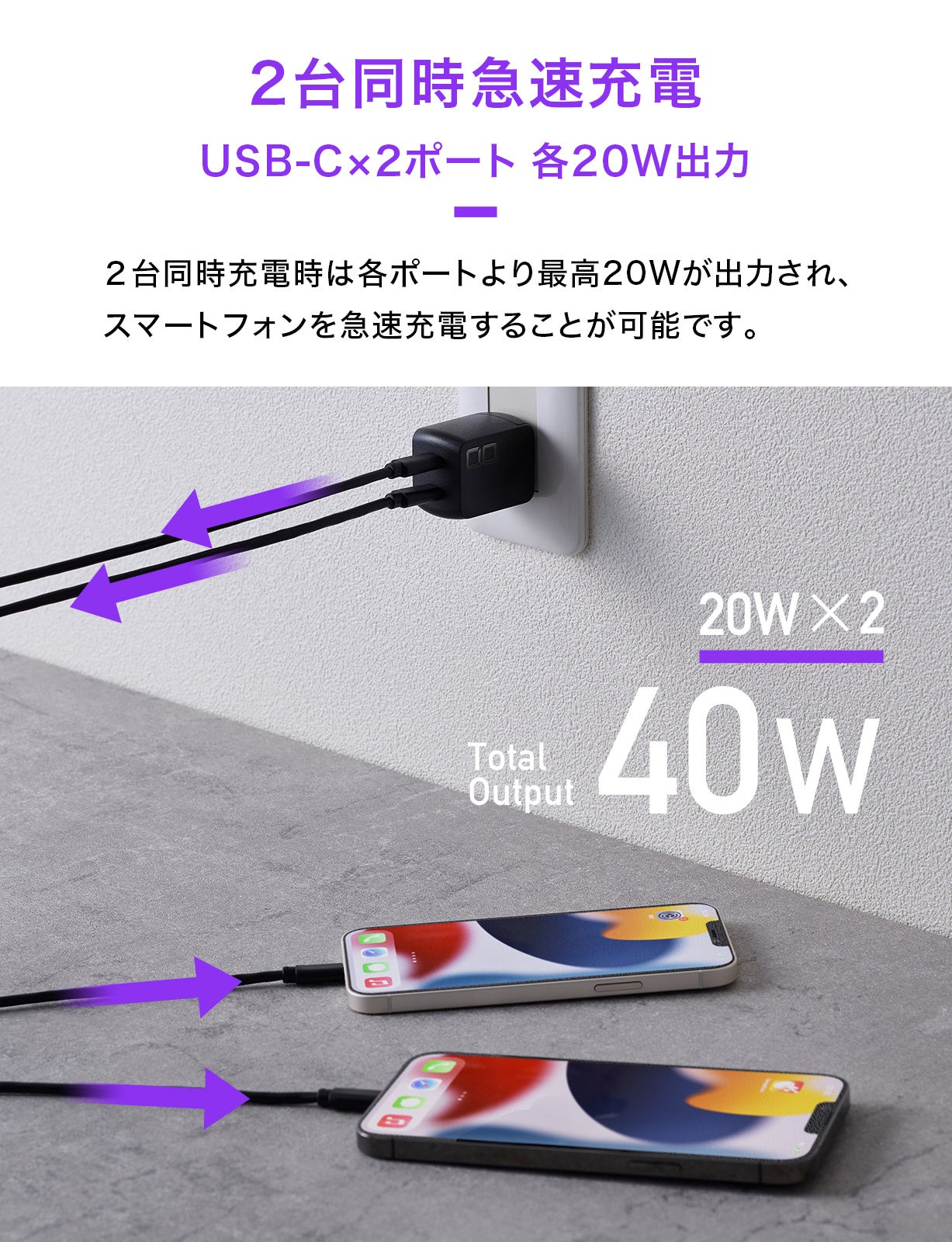 USB Type-C 2ポート搭載・最大30W急速充電・2ポート出力 合計40W・ボディは防傷素材採用