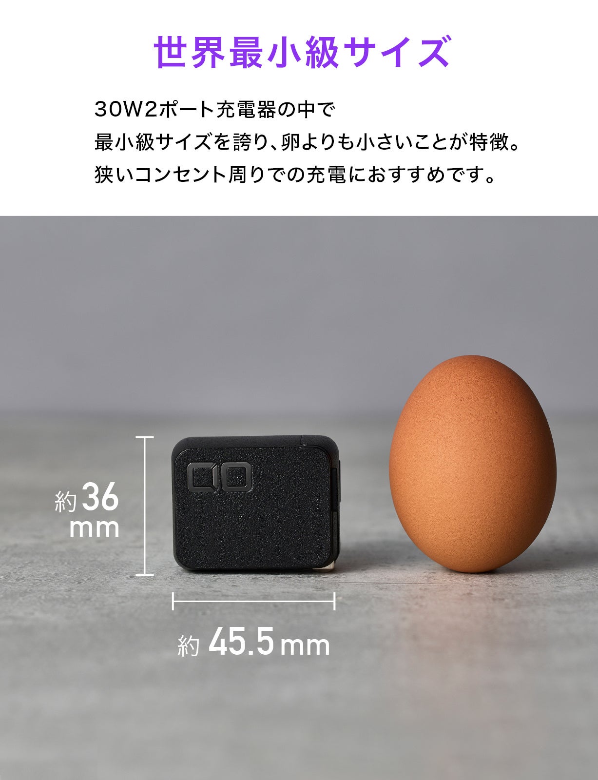 『NovaPort DUO 30W』は2ポート 30Wクラスで世界最小サイズを実現。サイズはデュアルポートの充電器の中でも、極限まで小型化し卵よりも小さいサイズを実現。持ち運びにも最適です。横幅サイズを抑えることでコンセント使用時も、他の充電器との干渉を少なく設計しています。
