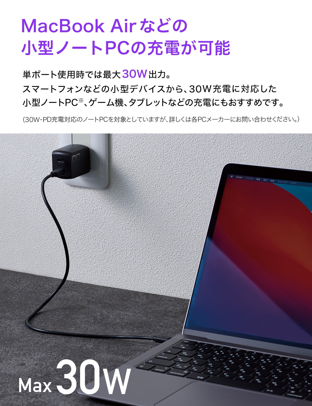 『NovaPort DUO 30W』は単ポート使用時にて最大30Wの出力に対応。スマートフォン・タブレット、イヤホン、スマートウォッチをはじめとしたスモールデバイスはもちろん、MacBook Airの充電も可能で30W充電に対応したノートPC、家庭用ゲーム機などの充電にもおすすめです。お手持ちのデバイスを選ぶことなく幅広く充電可能です。