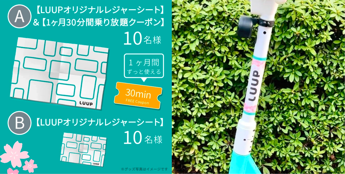 A:【LUUPオリジナルレジャーシート】と【1ヶ月30分間乗り放題クーポン】のセット 10名様