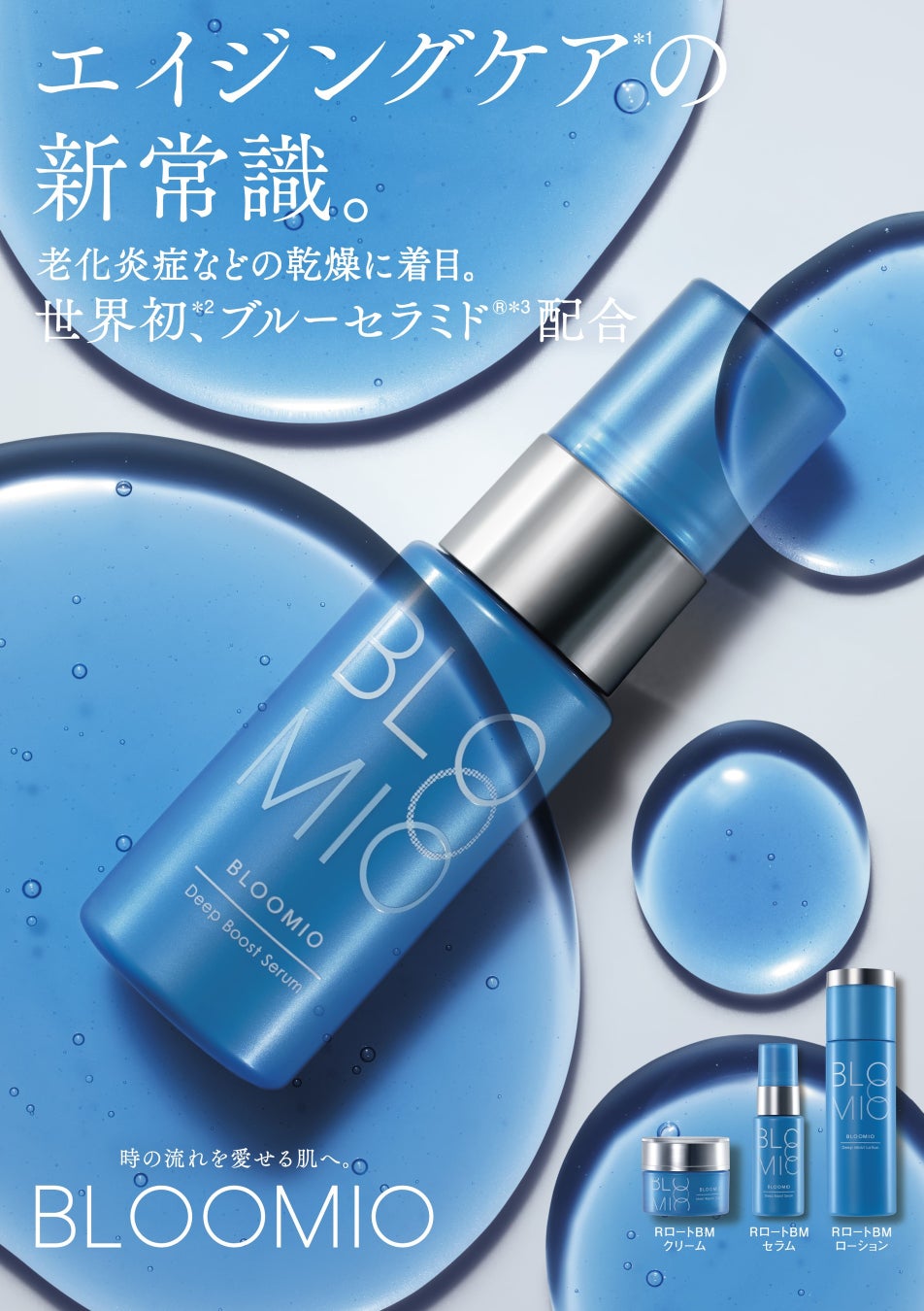 “なんだか不調な肌”に向け、エイジングサイン ※1の根本原因※2を研究。「BLOOMIO(ブルーミオ)」は、老化炎症による乾燥に着目し、肌悩みへアプロ―チする、先進のエイジングケアシリーズとして誕生しました。年齢に左右されず自分らしく活力あふれる前向きな毎日を応援します。