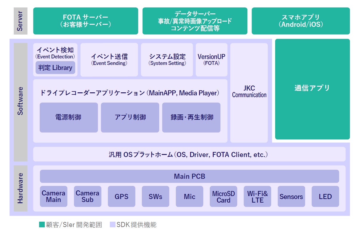 本機は、過酷な状況下でも、フルHD画質/広角撮影、およびHDR対応により高画質な映像記録を実現するとともに、汎用OSの採用により、衝撃検知や運転支援機能などの独自アプリケーションもオプションとして組み込むことができます。また、当社開発のSoftware Development Kit(SDK)により、フリートマネージメントシステムをはじめ、さまざまなシステムともデータを容易に連携できるため、短期間でのIoT・AIベースのテレマティクスサービス開発を可能とします。さらに、