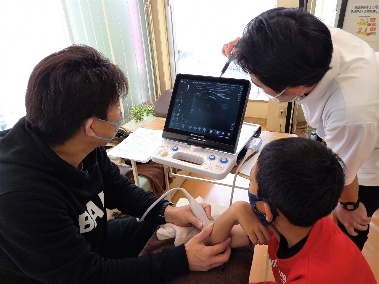 超音波エコーは、妊娠されている方にも使用されるように、安全かつ様々な動作での身体の状況を画像として映しだすことができる検査法で、肘以外の気になる部位の検診もエコーを使⽤して⾏われました。