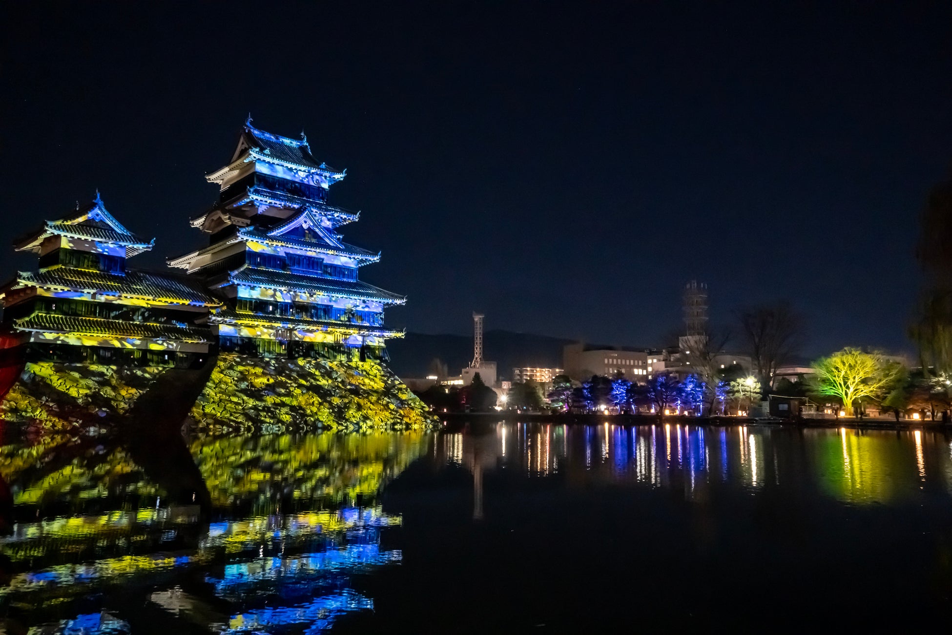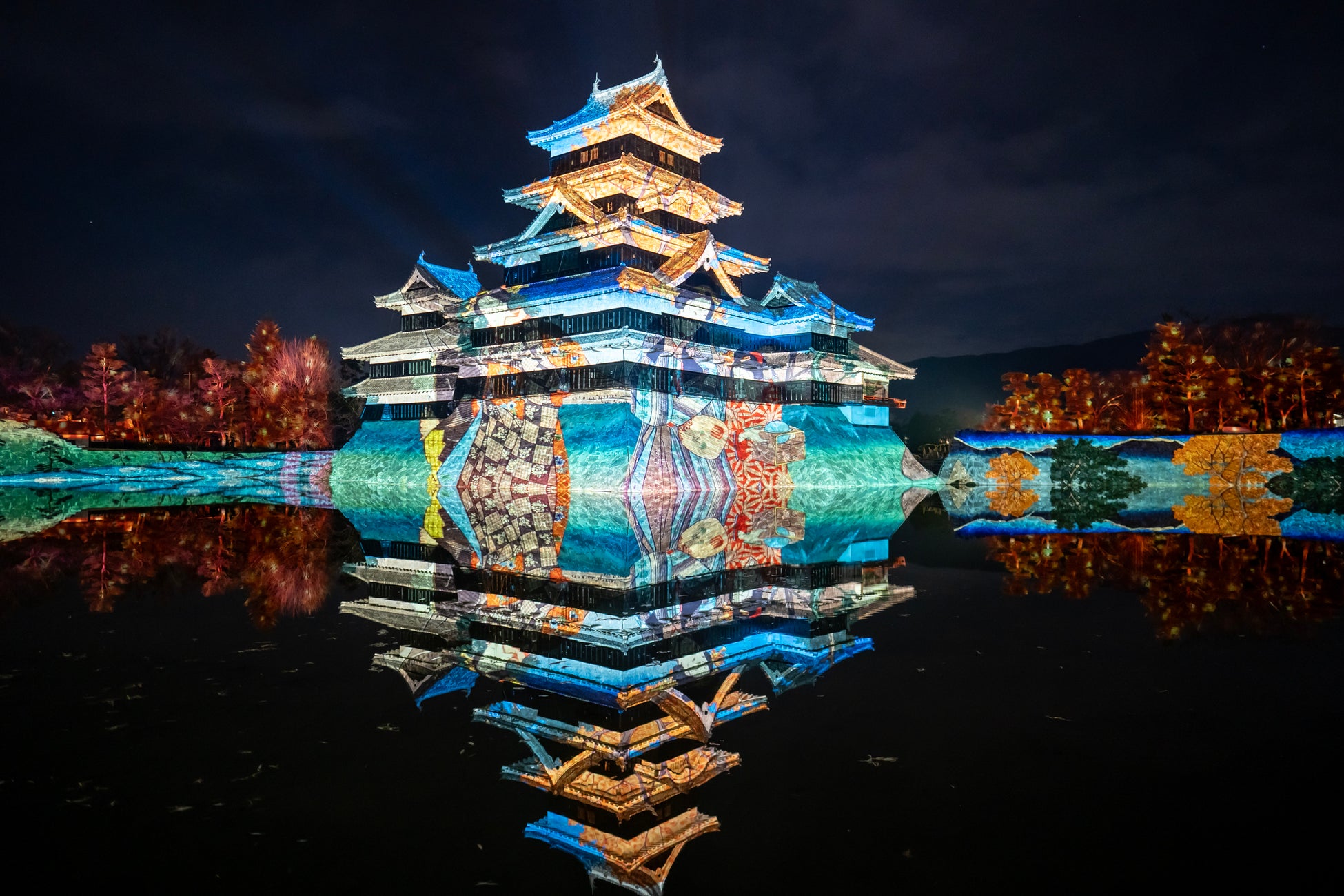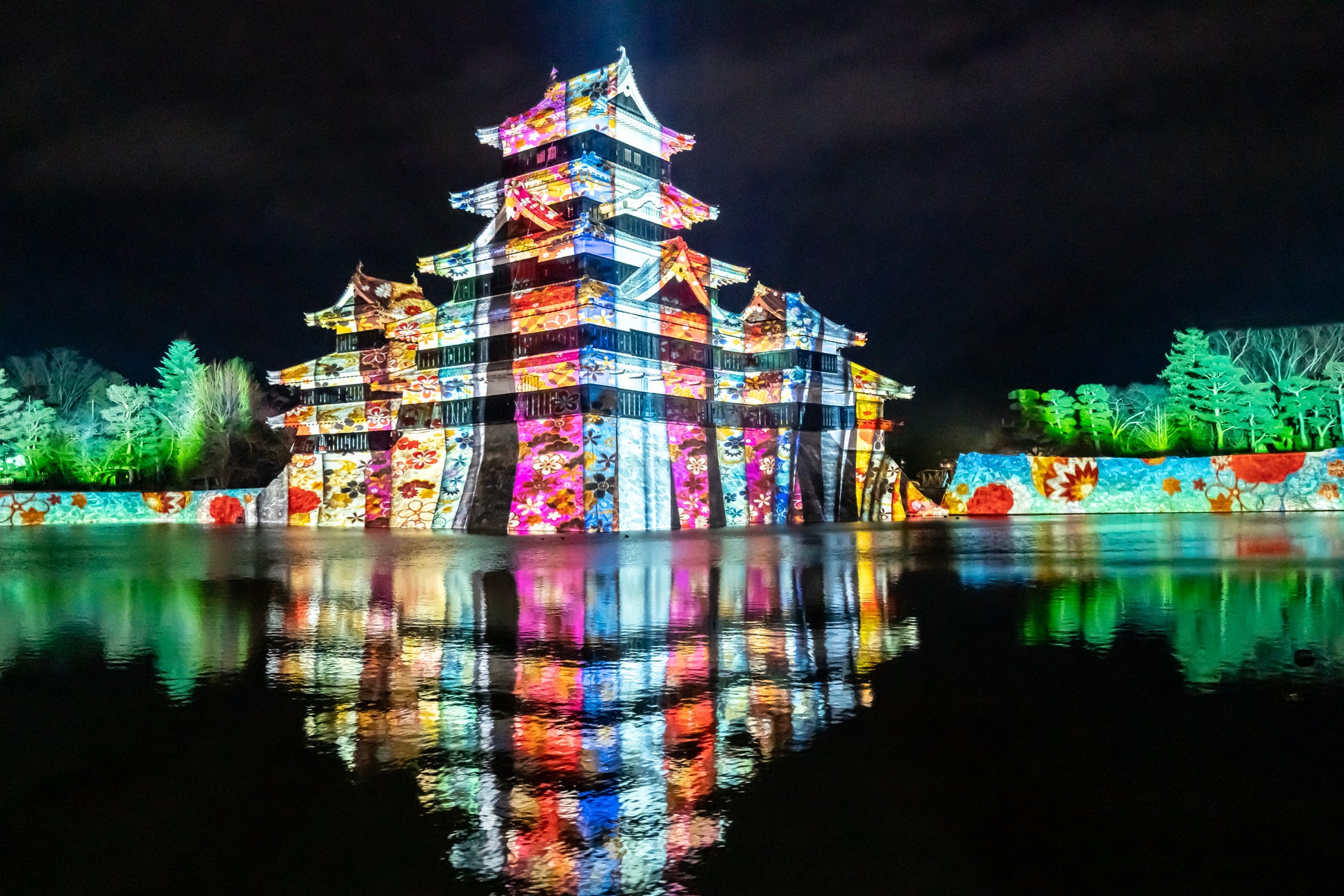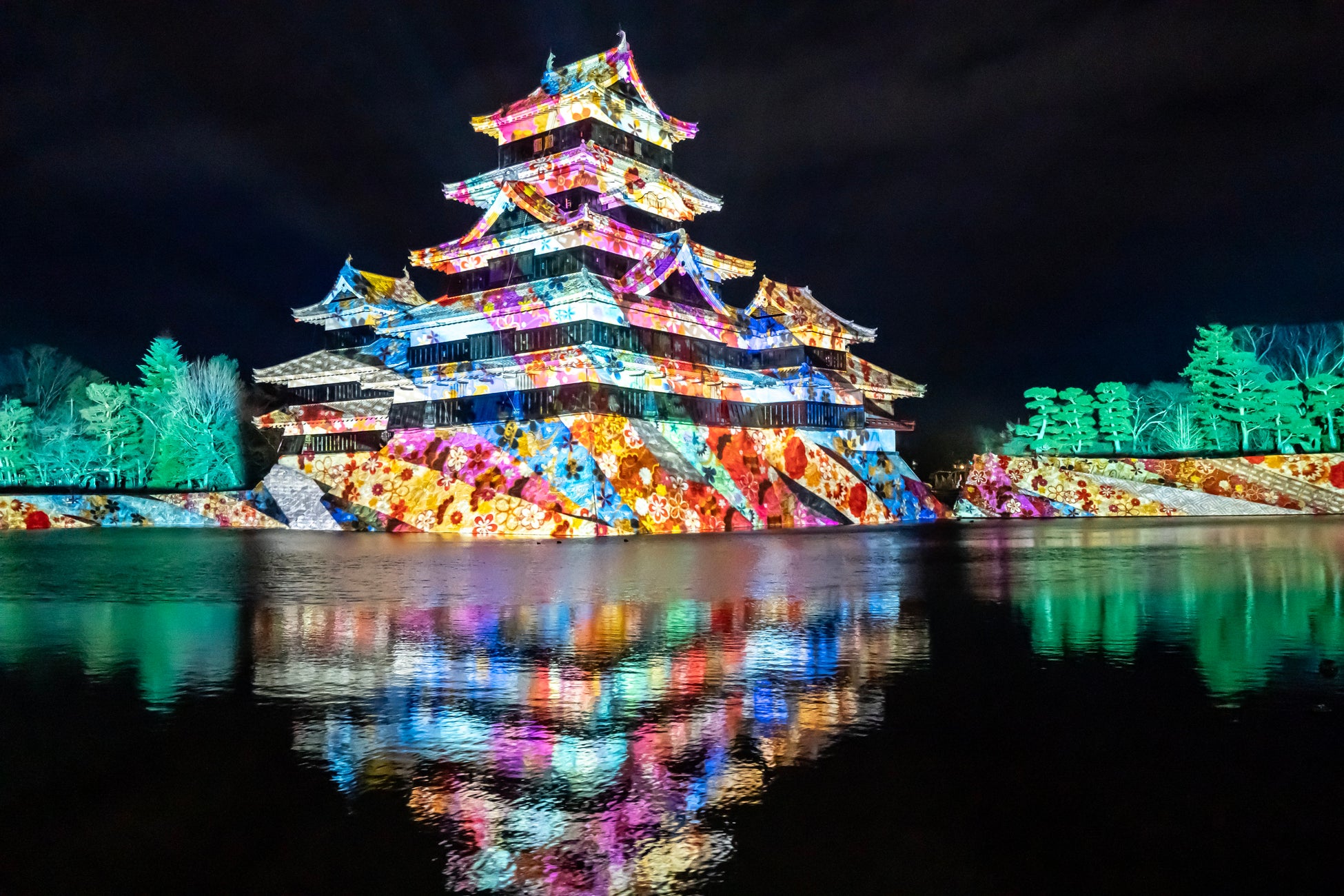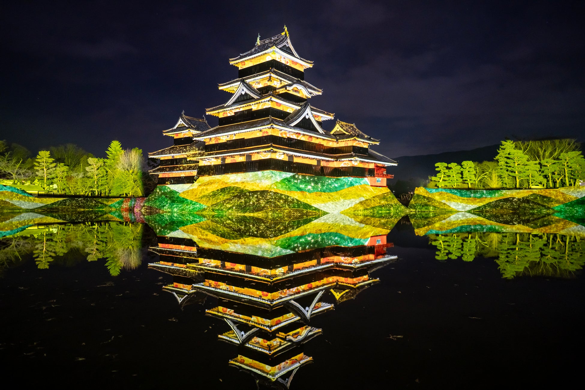 【内容】 現存国宝5天守の一つで五重六階の天守の中で最古の国宝 松本城の天守や石垣に、葛飾北斎や歌川広重による信州ゆかりの浮世絵や豪壮な天守を築いた松本城主・石川数正が描かれた屏風絵が立体的に躍動するデジタルアニメーション、松本てまりや深山織、藍染めなど松本市ならではの伝統工芸をモチーフとしたデジタルアート、春に咲き誇る北アルプスの花々など、ダイナミックで幻想的なプロジェクションマッピング映像を投影します。