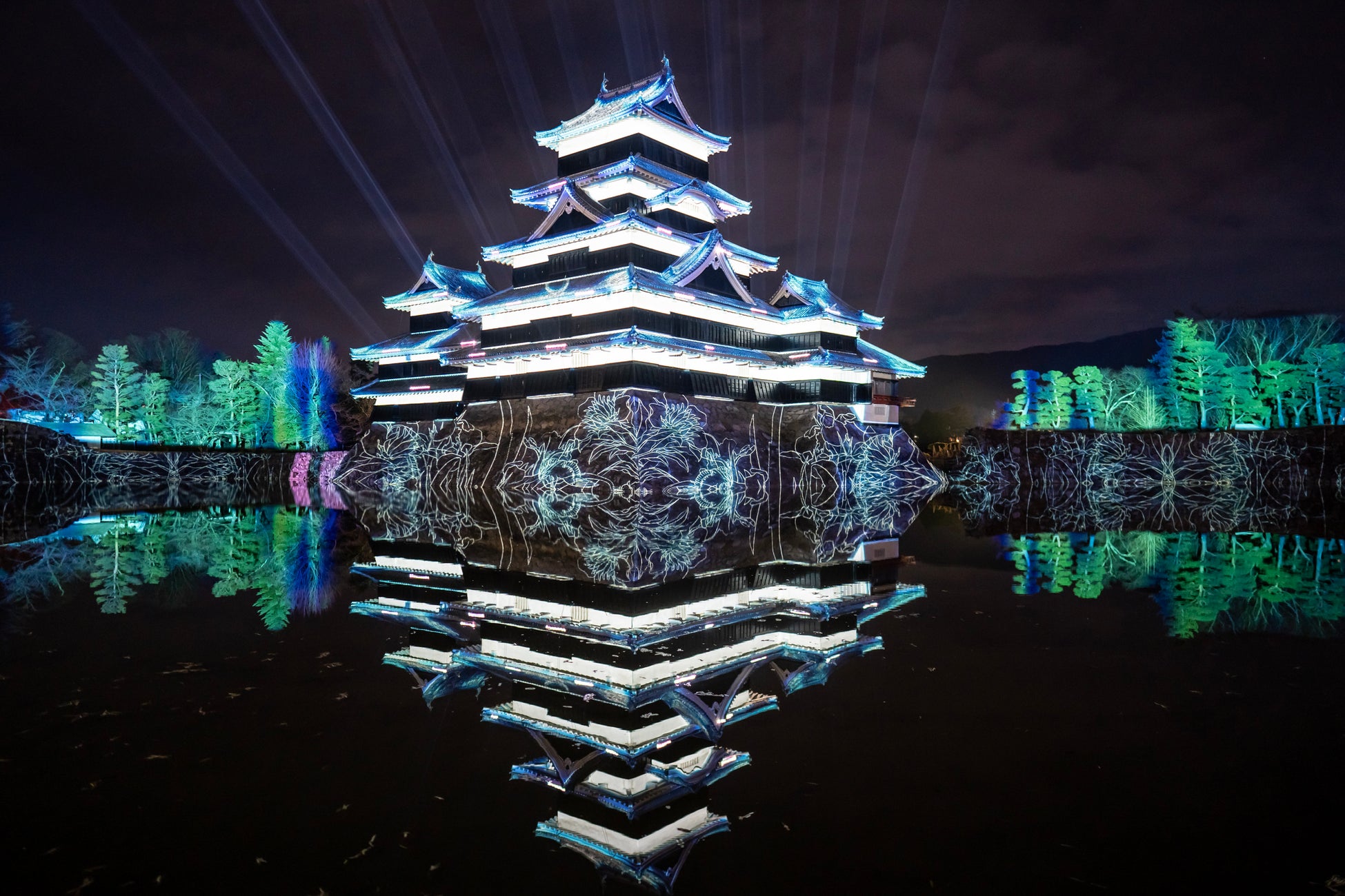 現存国宝5天守の一つ国宝 松本城の天守や石垣にダイナミックなデジタルアート映像を投影。先端技術を駆使し、天守でのプロジェクションマッピングとレーザーマッピングを融合させた迫力ある光の演出に大きな反響。