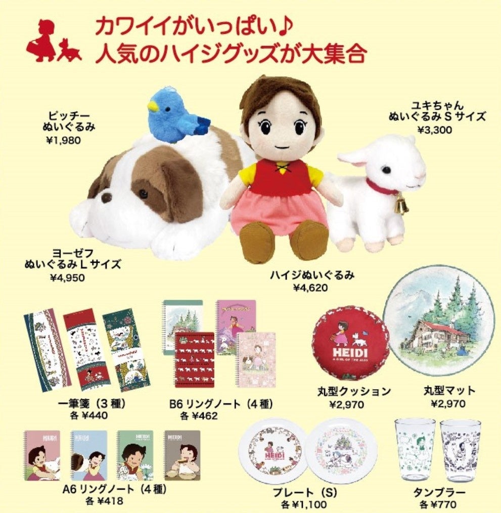 ハイジ、ユキちゃん、ヨーゼフなど人気キャラクターの楽しいグッズぬいぐるみやステーショナリー。