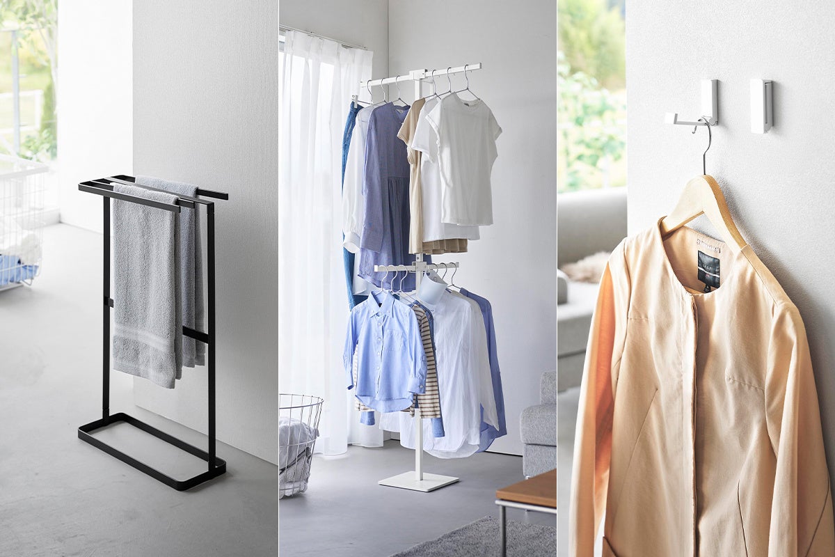 【山崎実業 新商品のお知らせ】 コンパクトに折りたためる室内用の物干しスタンドや、タオルを横からスッと楽に掛けられるスリムなタオルハンガーなど、新商品が発売になりました。