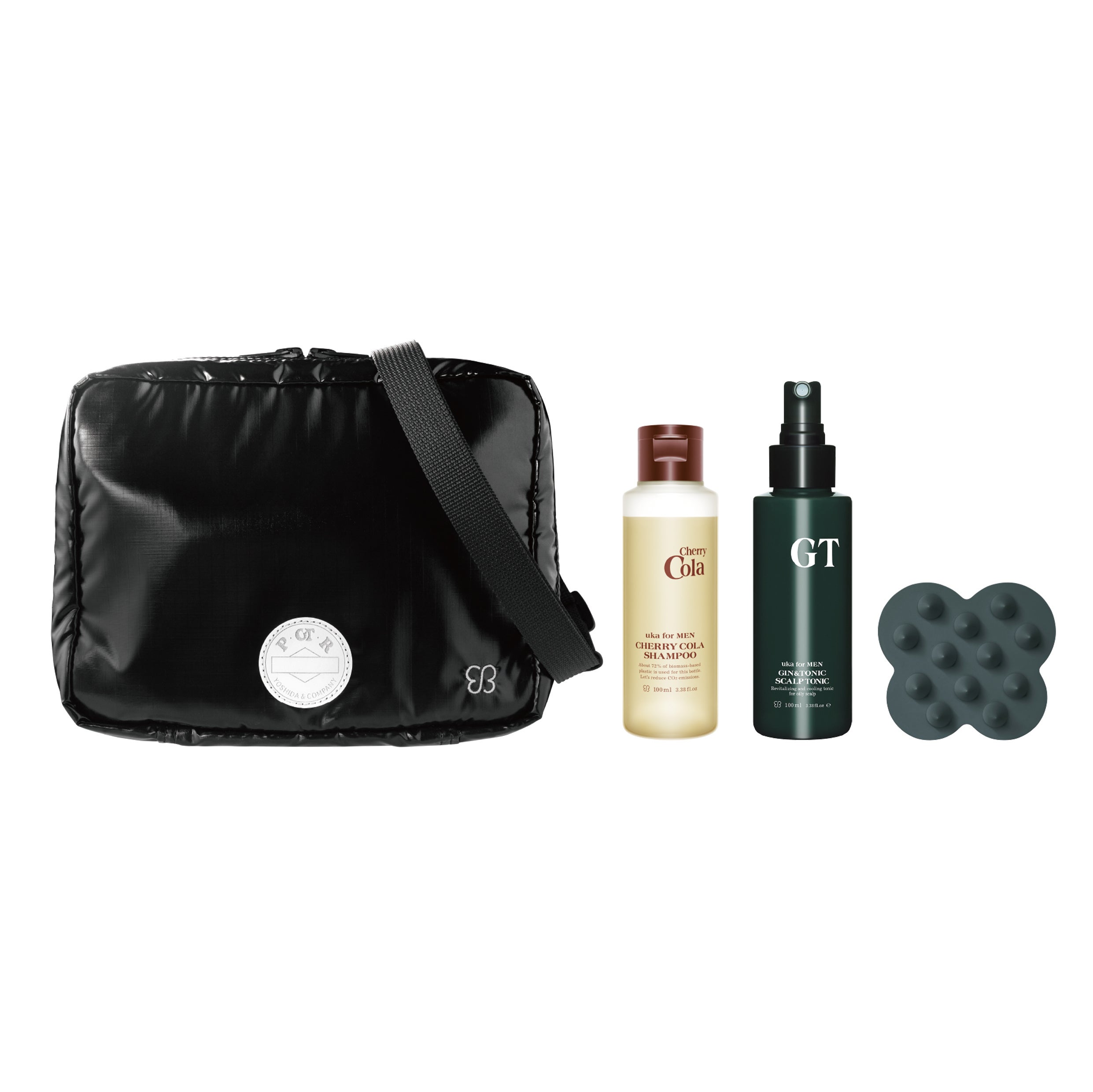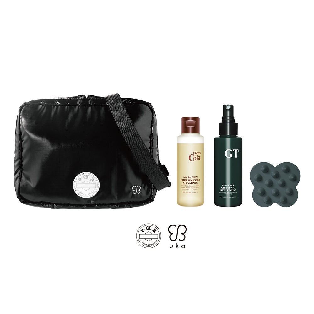 ukaで販売するポーチにはレモン、シナモン、バニラの天然香料で表現したチェリーコーラの香りに、メントールで爽快感をプラスしたuka for MEN Shampoo Cherry Colaを。4月28日(金)からセット内容をスタイリング剤の代わりに、メンソールの冷感が心地よい頭皮用トニックのuka for MEN GT Scalp Tonicへ変更しました。キー成分となるクロモジウォーター(整肌)とセンブリエキス(整肌)が頭皮を健やかに。吉田カバンで販売するポーチには爽やかでセンシュアルな香りのuka for MEN E SHAMPOOを。スタイリング剤の代わりに、バニラビーンズから抽出したバニリルブチル(整肌)でほどよい温感のあるuka for MEN E Scalp Tonicをセットしました。