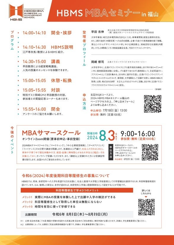HBMS MBAセミナーin福山 を開催します!~広島ドラゴンフライズ ゼネラルマネージャー 岡崎修司氏 登壇~