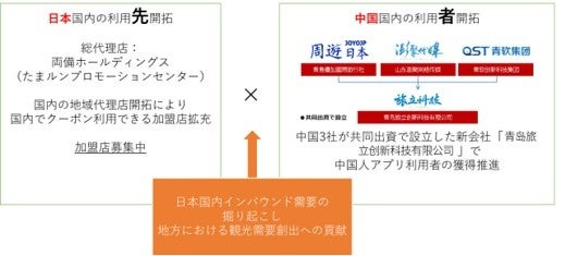 Japan coupon(JP酷鵬)共同企業体の中の一社である、中国現地旅行代理店「周遊日本」が、連携する中国国内旅行会社180社に展開し、旅行者向けに直接利用を案内するほか、団体旅行では、添乗員が加盟店への送客に結び付けます。また、メディア会社 山東澎聚网络传媒集団(Shandong pengju network Media group)が中国現地マスメディアの情報発信を行ないます。