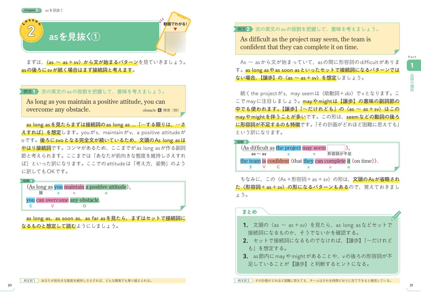 この本では、英文を「前から読める」ようになること、英文を「すばやく正確に読み解ける」ようになることをゴールとし、そのための文法的判断力が身につくように解説しています。さらに、対象大学の英文和訳問題に出題されるような訳しにくい英文を自然な日本語に変換する力も身につけることができます。
