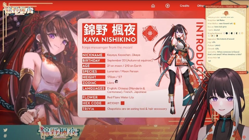 月の裏側からやってきた忍者の使い、楓夜。地球には、一族のためにお月見のお供を集めにやってきました。お祭りは年に一度だけですが、ある日の任務で見た感動的なアイドルコンサートに心奪われ、楓夜は地球にとどまることを決意!今はVTuberとして歌いながら、その歌声を月まで届けるのが夢。 楓夜はとっても元気で、みんなとの楽しい時間をお祭りみたいに過ごすのが大好き!それに、アイドルと美味しいごはんには目がない。 もしかしたら、地球のごはんが楓夜をここに留めている秘密かも?