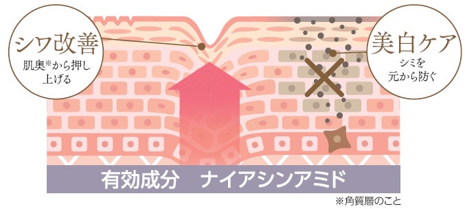 有効成分「ナイアシンアミド」配合で、ハリを支える真皮層にアプローチ。凹みを押し上げ、肌奥※からシワを根本改善。更にメラニンを抑制し、美白※3ケアまで叶えます。