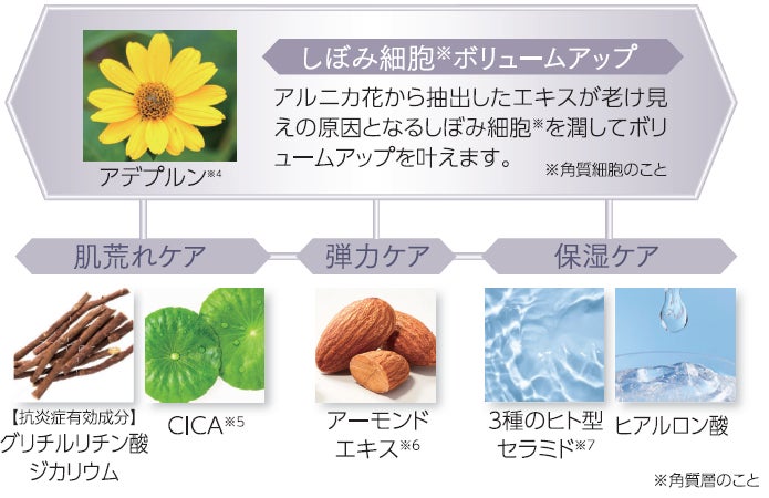 贅沢美容成分で、シワの原因となる肌荒れ、乾燥などから多角的にサポート。さらに、「アデプルン※4」を配合し、ボリュームアップをスキンケアで叶えます。