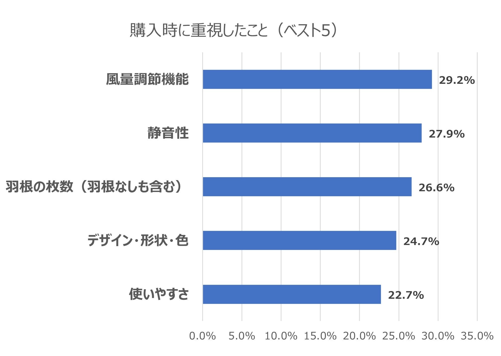 購入時に重視したポイントは、「風量調節機能」が29.2%と最も多く、次いで「静音性」、「羽根の枚数(羽根なしも含む)」という結果になりました。