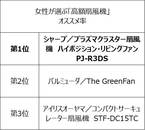 2023年5月~6月に実施した調査において、 「ダイソン/Dyson Pure Cool」(※)が女性が選ぶ「高額扇風機」(約1万円以上)3年連続利用率第1位(同商品は使いやすさの満足度、総合満足度も第1位)となりました。2020年の利用率1位もダイソンのシリーズで、4年連続羽根なし扇風機が根強い人気であることがうかがえます。 「バルミューダ/The GreenFan」はデザインについての満足度第1位、 「シャープ/プラズマクラスター扇風機 ハイポジション・リビングファン PJ-R3DS」はオススメ率第1位を受賞しました。