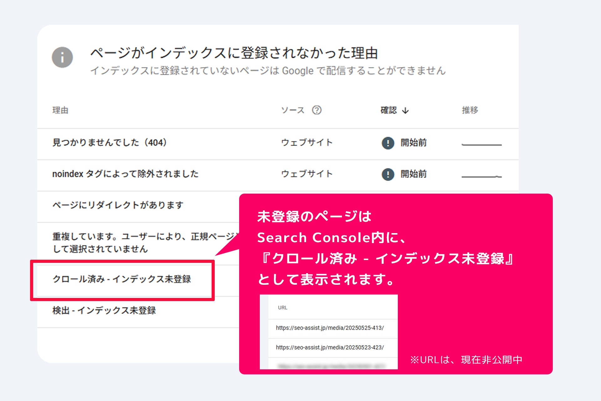 Search Consoleの状況:1ヶ月経っても「クロール済み - インデックス未登録」