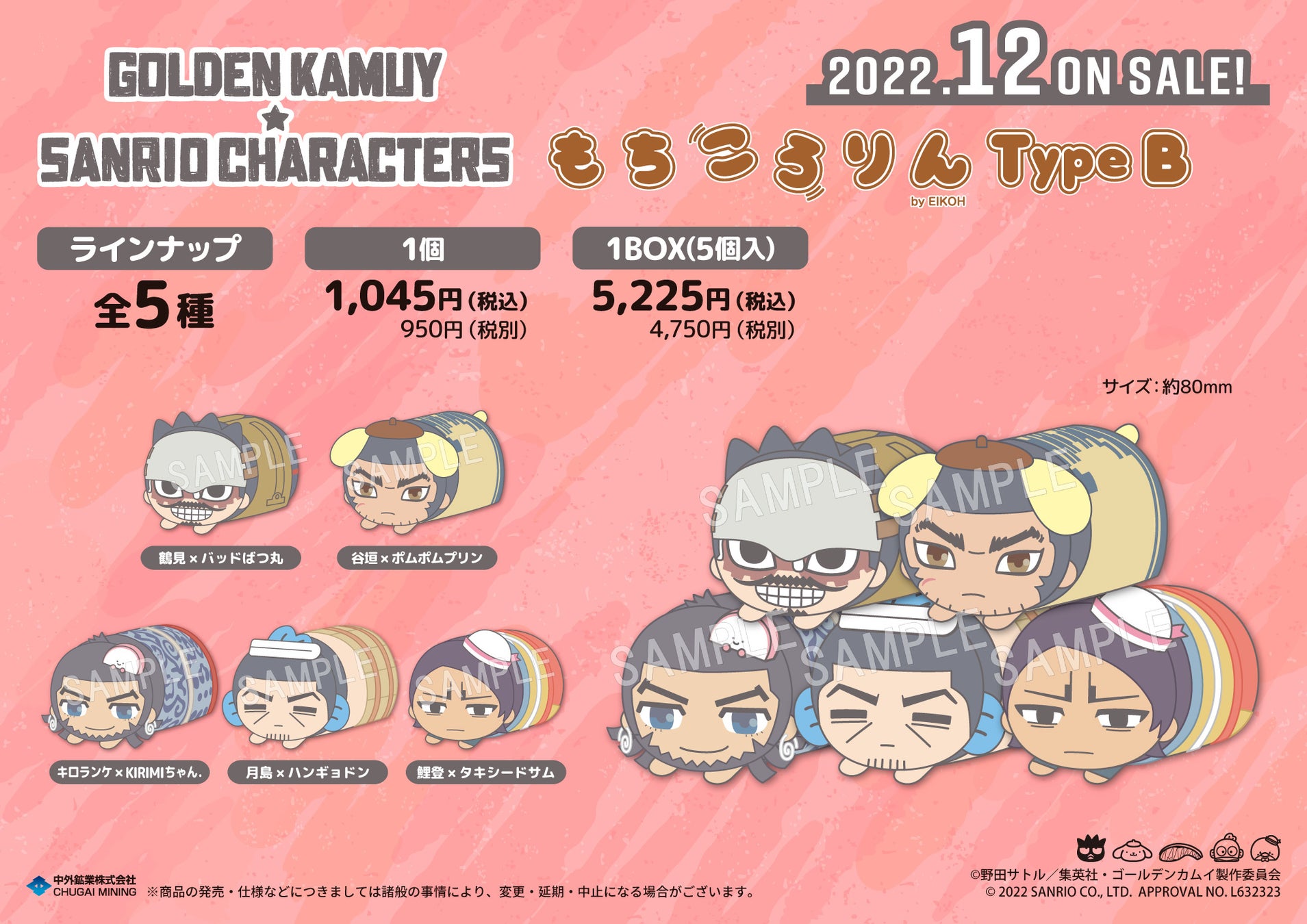 キャラクターグッズの商品企画・製作・販売を行う中外鉱業株式会社コンテンツ部は、TVアニメ『ゴールデンカムイ』より、「もちころりん TypeA」「もちころりんTypeB」「お座りぬいぐるみマスコット」のサンリオキャラクターズコラボバージョンの販売をいたします。2022年12月発売予定となります。