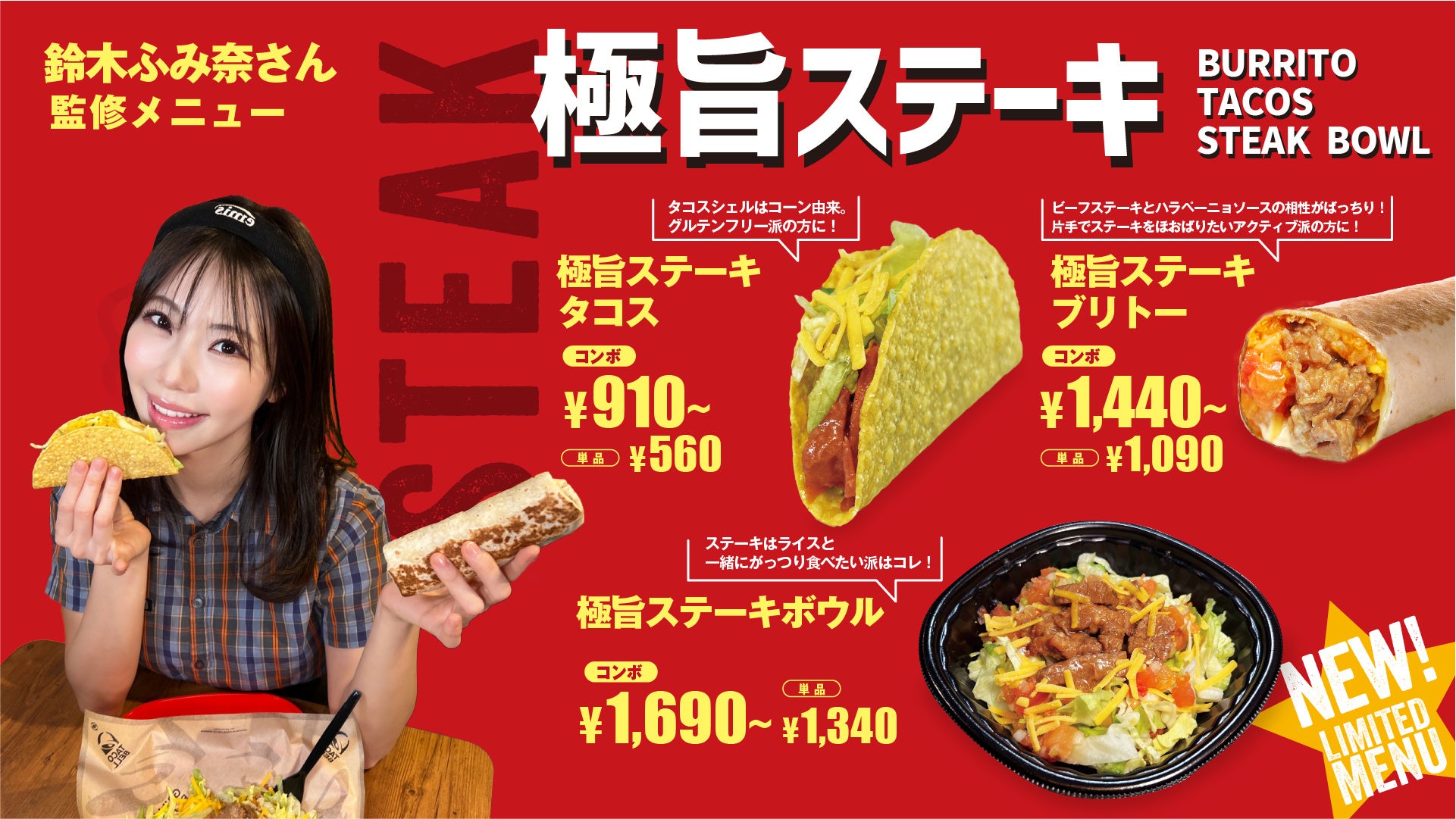 鈴木ふみ奈presents 春のステーキ三刀流フェア!【俳優 タレント 鈴木ふみ奈 ✖ Taco Bell コラボ】タコベルジャパン初!ステーキ肉を使った新メニュー2025年3月27日(木)発売開始!