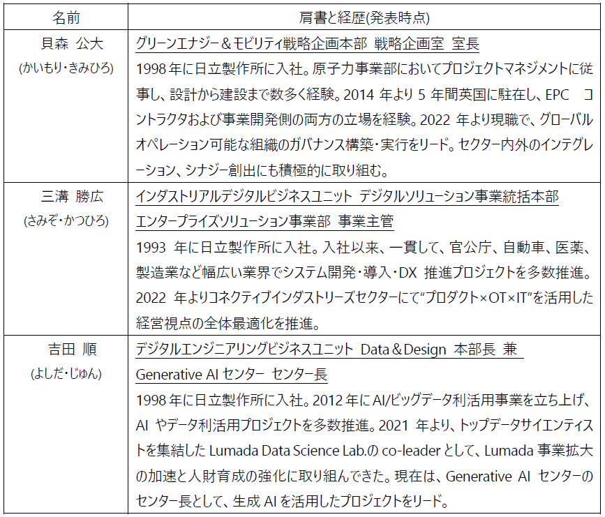 株式会社日立製作所(以下、日立)は、急速に進化する⽣成AIを日立全社の成長エンジンとして積極的に活用し、業務の生産性を飛躍的に向上させるとともに新たな事業機会を創出する生成AIを活用したトランスフォーメーション(AIトランスフォーメーション)を社内外で推進しています。今後、さらに取り組みを強化していくため、各事業領域におけるAIトランスフォーメーションの推進責任者として、「Chief AI Transformation Officer」を12月1日付で新設し、グリーンエナジー&モビリティセクター、コネクティブインダスリーズセクター、デジタルシステム&サービスセクターの3セクターそれぞれにおいて、貝森 公大、三溝 勝広、吉田 順が就任しました。