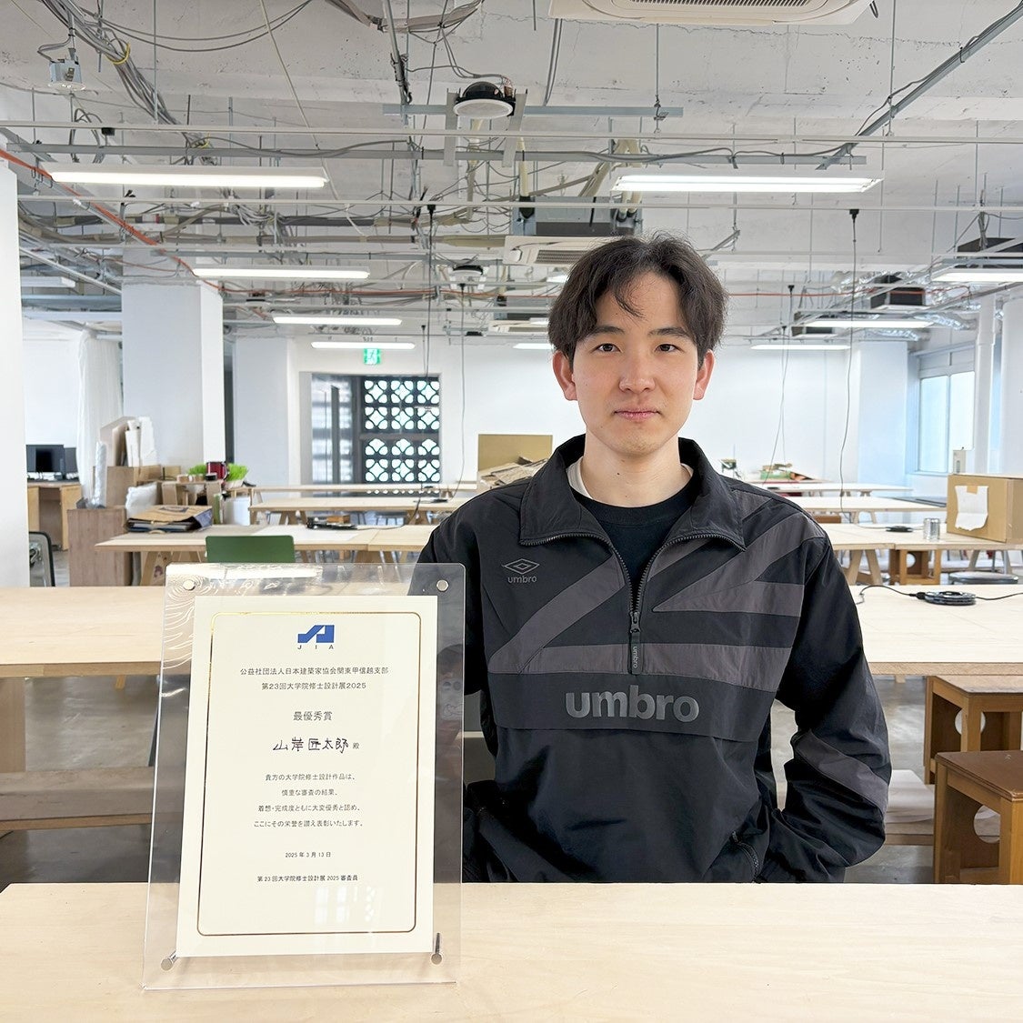 第23回JIA修士設計展2025にて最優秀賞を受賞することができました。このような栄誉ある賞をいただくことができて大変光栄に思っています。今回、修士設計にあたり支えていただいた家族や指導教員の伊藤 泰彦先生をはじめ学科の先生方・スタッフの皆さんや同期、後輩には大変感謝しています。こういった貴重な経験をこれからの設計に活かしていきたいと思います。
