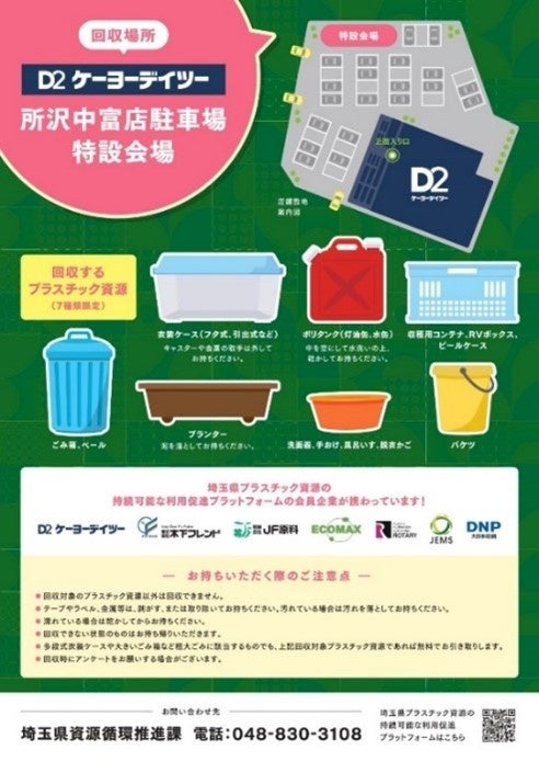 〇「埼玉県プラスチック資源の持続可能な利用促進プラットフォーム」 *の取り組みとして、DNPと埼玉県、株式会社ケーヨー(店頭受付)、株式会社木下フレンド・有限会社JF原料(資源回収、再資源化(破砕))、株式会社エコマックス(再資源化(ペレット化))、ロータリー株式会社(リサイクル製品製造)、株式会社JEMS(「見える化」システム開発)が連携し、今回の取り組みを推進します。DNPは生活者と企業の各種コミュニケーション施策や環境負荷算定に関するノウハウ等を活かし、コミュニケーションモデルの構築や運用のプロデュースを担います。