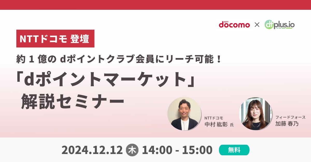 株式会社フィードフォース(所在地:東京都港区、代表取締役:塚田 耕司、以下「フィードフォース」)が提供する、マーケターのためのデータフィード管理ツール「dfplus.io」は、無料オンラインセミナー「NTTドコモ登壇!dポイントマーケット解説セミナー」を 2024 年 12 月 12 日(木)に開催いたします。