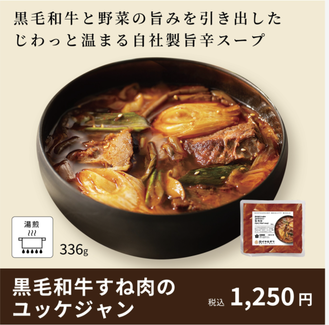 旨みと辛みをなじませるように寝かせた自社製コチュジャンベースで牛肉を一晩漬け込みました。さらに、じっくり煮込んだ牛肉のダシに長ねぎ、豆もやし、ゼンマイ、椎茸などを加え、食べ応えのある旨辛スープに仕上げています。
