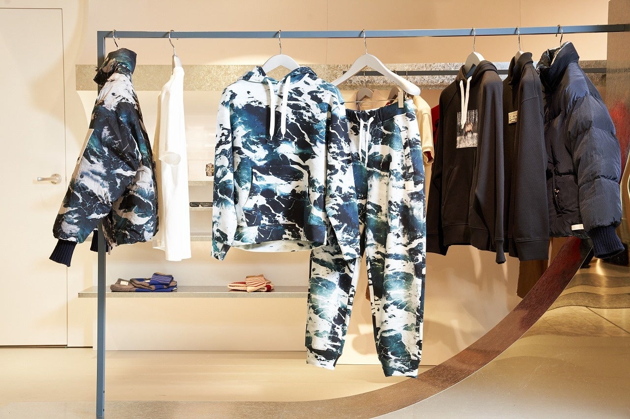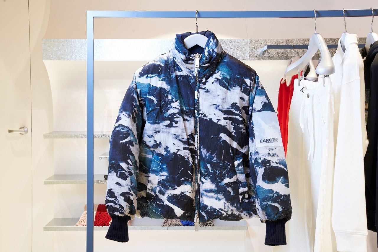 北極の世界からインスピレーションを得た店内はグレーを基調とした冬らしい世界観で、環境へのメッセージも込められています。そして店内には、北極圏を旅の中で自然から与えられたあらゆるインスピレーションを反映させたコレクションが揃います。
