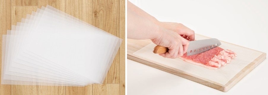 肉や魚を切ったり、にんにくのみじん切りをしたりなど、色やにおい移りが気になる食材を切るときに便利なまな板シート。まな板シートを使えば、調理中のまな板を洗う回数が減少し、まな板の嫌な汚れが付きにくくなります。シート形状なので、そのまま持ち上げれば、ボウルやフライパンへの移し替えも簡単です。