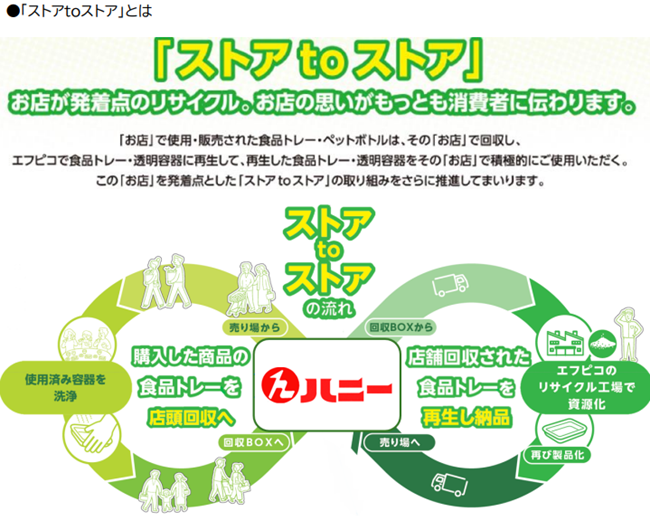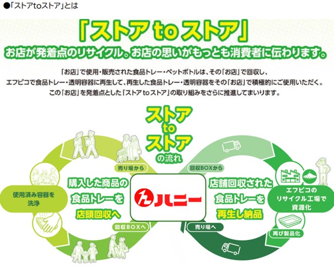株式会社エフピコ(本社:東京都新宿区、代表取締役会長:佐藤 守正、以下「エフピコ」)と協同組合ハニー(本社:福井県福井市、理事長:木村 博常、以下「ハニー」)は、持続可能な循環型社会の実現を目指し、ハニー加盟店の36店舗を対象に、地域の皆さまと共に水平リサイクル(※1)の協働を強化する「エコストア協働宣言」を発表いたします。