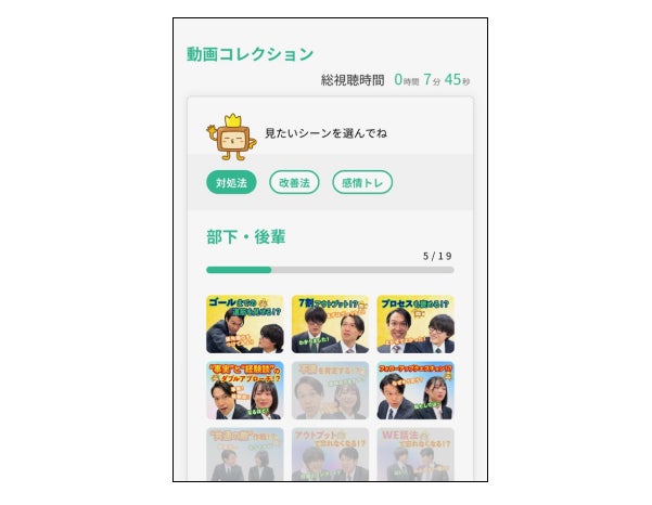 動画コレクション:学習可能な動画の視聴状況が一覧で確認できるため、効率よく次の動画に取り組めます