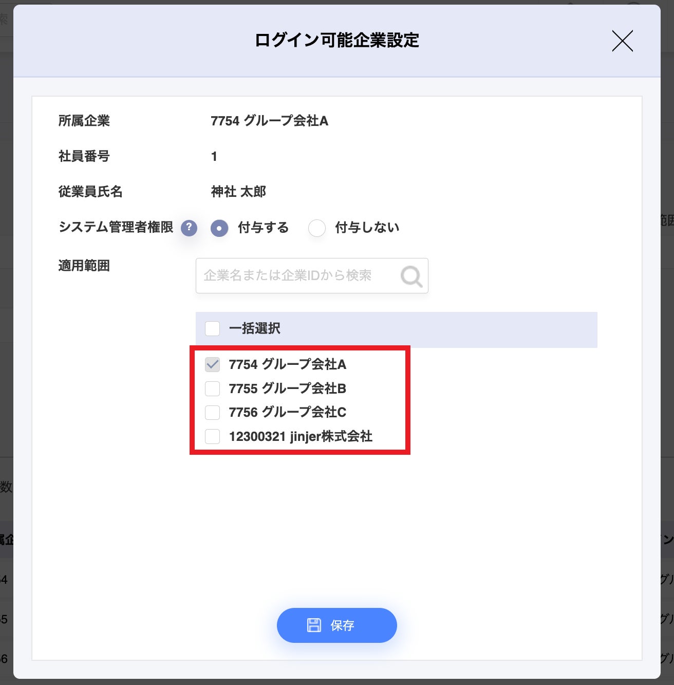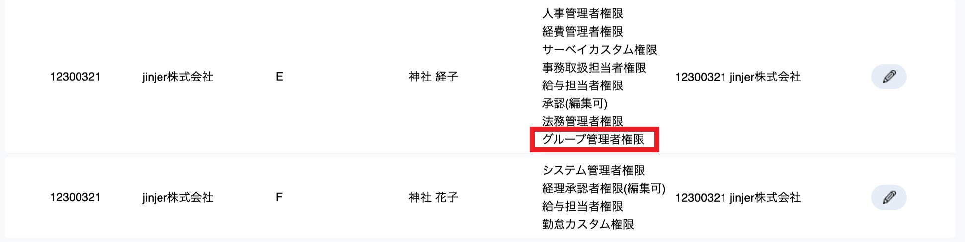 ・企業Bにおいて、「ジンジャー人事労務」の従業員情報を編集できる