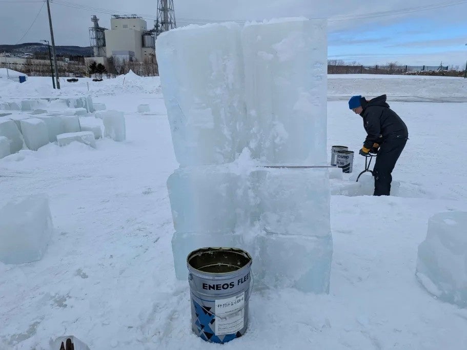 制作の第一段階である「氷柱の積み上げ」では、一本約100kgという氷の重さに直面。しかし、ここで運営スタッフや山﨑市長自らが重機を操りサポートするという、紋別ならではの温かい協力体制が築かれました。