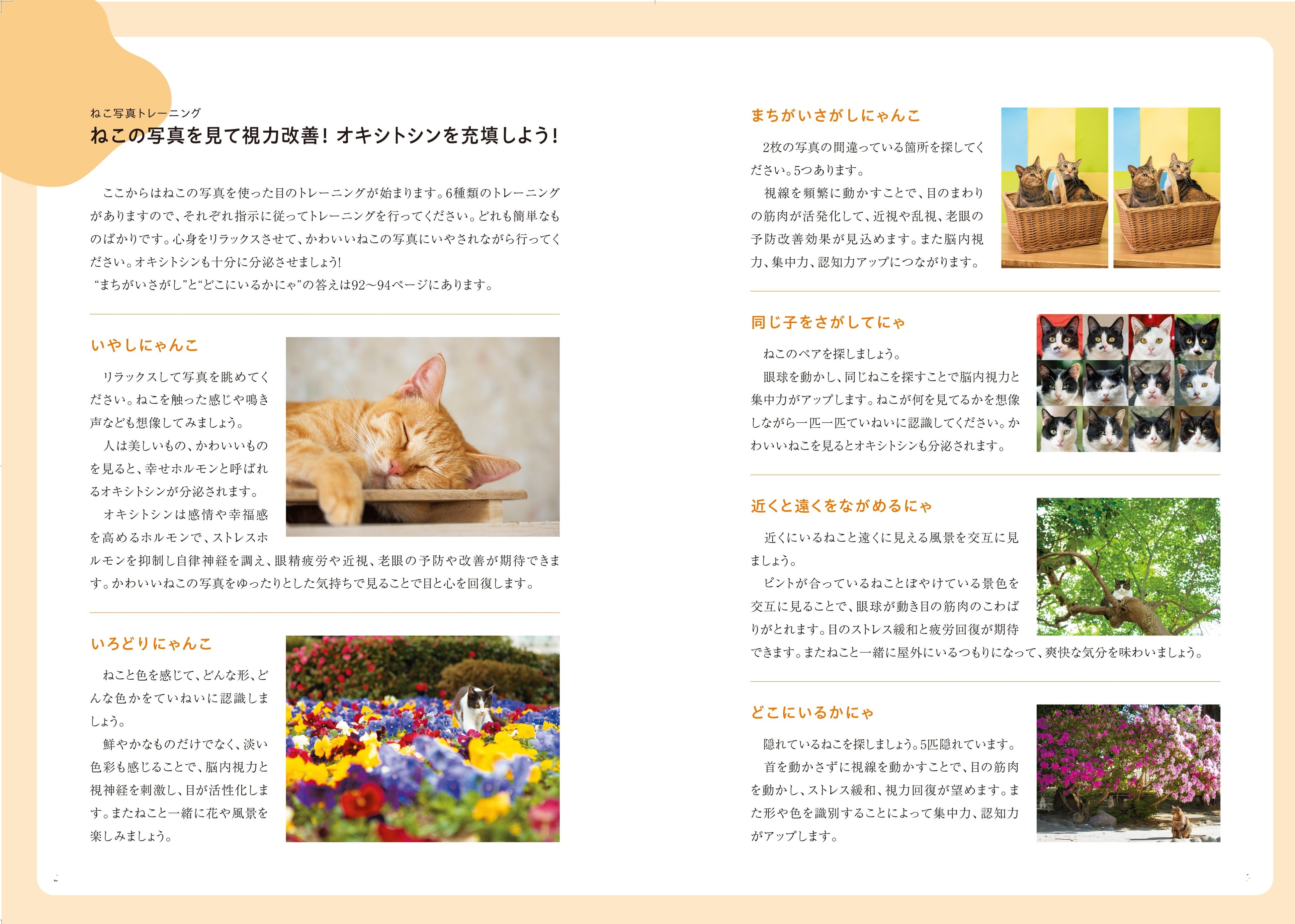 難しい間違い探しや同じねこを探す、隠れているねこを探す問題など、視力回復と共に脳も活性化させ、目が捉えた情報を補完する「脳内視力」も高めます。