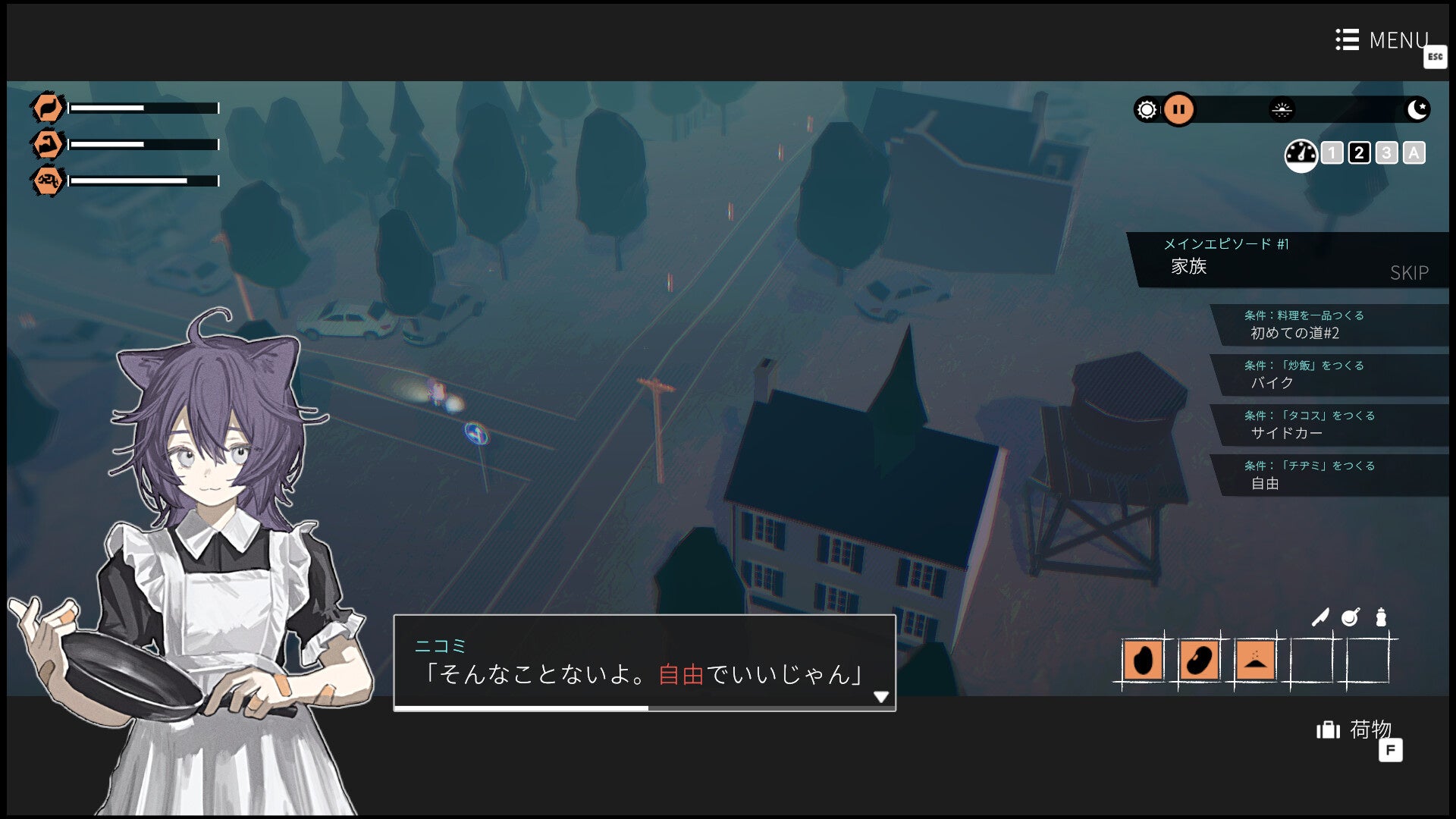 料理をして満腹度やほかのパラメータを回復しましょう。
