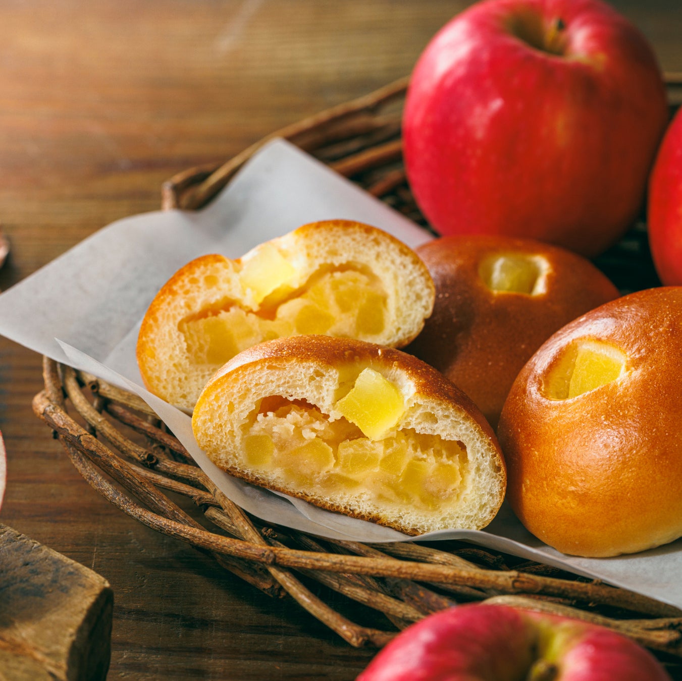 ほのかにりんごの食感が残る風味豊かなりんごあんを酒種生地で包み、りんごプレザーブをトッピングしました。