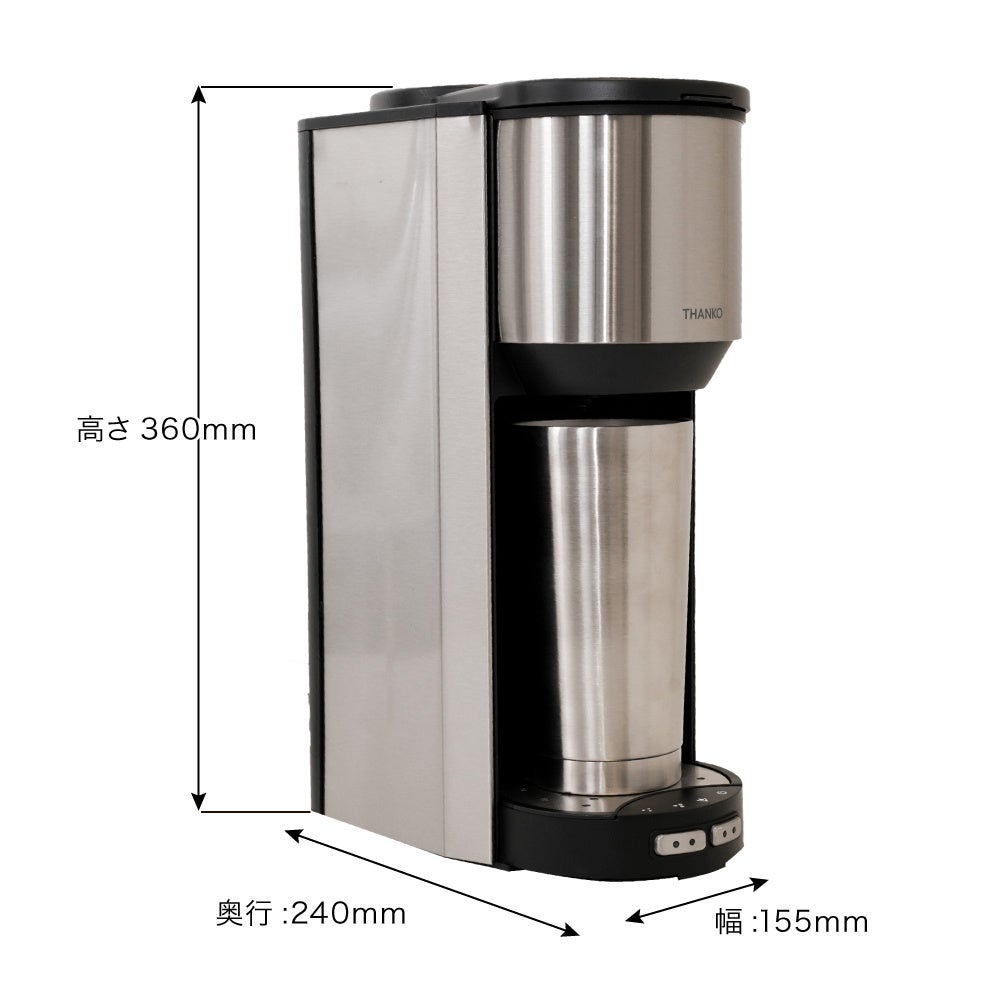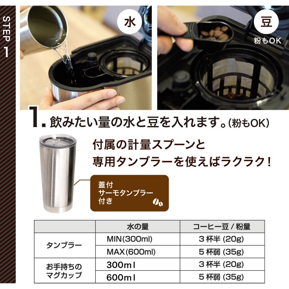 600mlの蓋付タンブラーが付属し、一度に最大600mlのコーヒーが抽出可能。