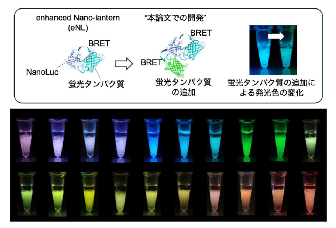 今回、研究グループは、生物発光色を変化させる新たな方法を開発することで、これまででは最大の20色の生物発光タンパク質シリーズ「eNLEX」を開発しました。
