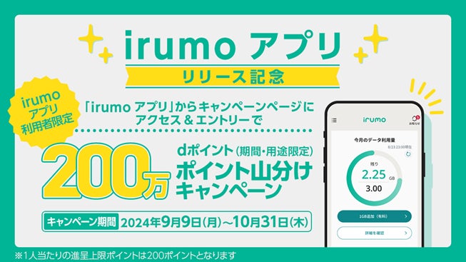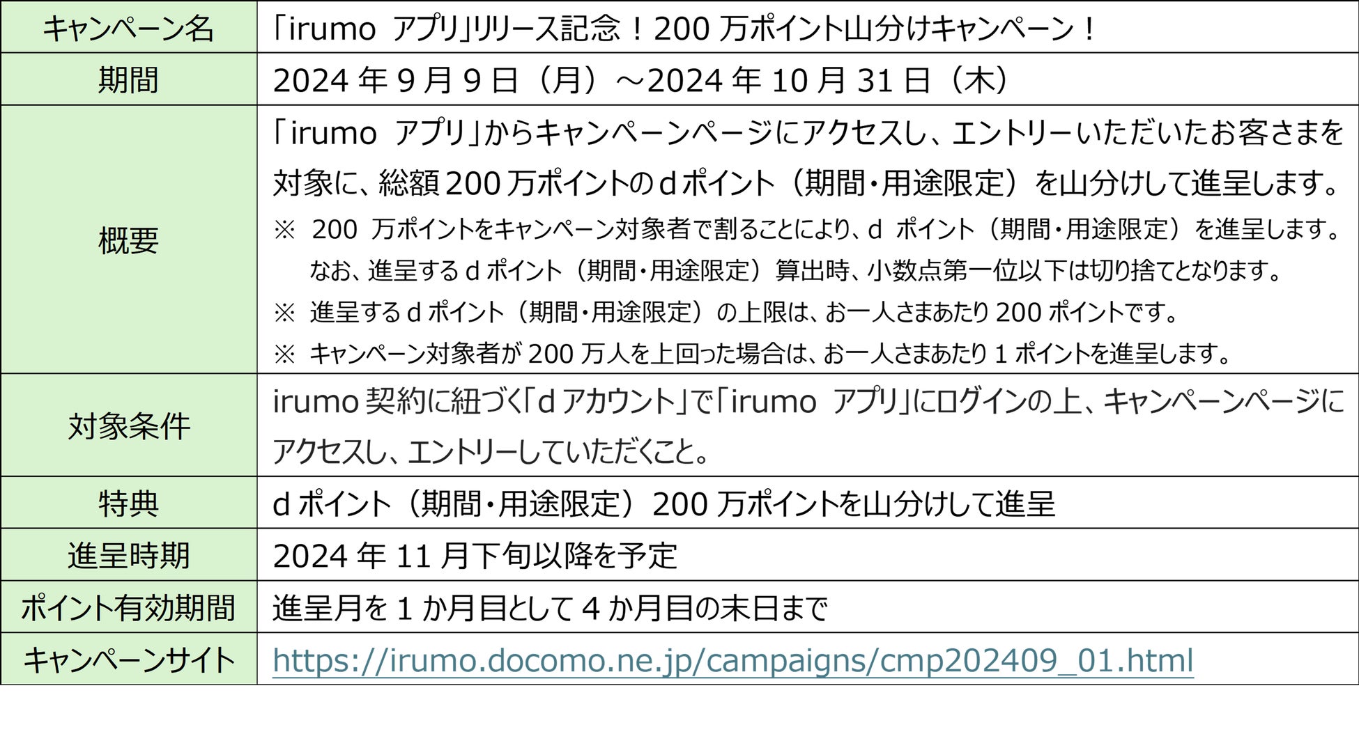 株式会社NTTドコモ(以下、ドコモ)は、「irumo アプリ」の提供開始を記念し、「『irumo アプリ』リリース記念!200万ポイント山分けキャンペーン!」(以下、本キャンペーン)を2024年9月9日(月)から2024年10月31日(木)までの期間で開催します。
